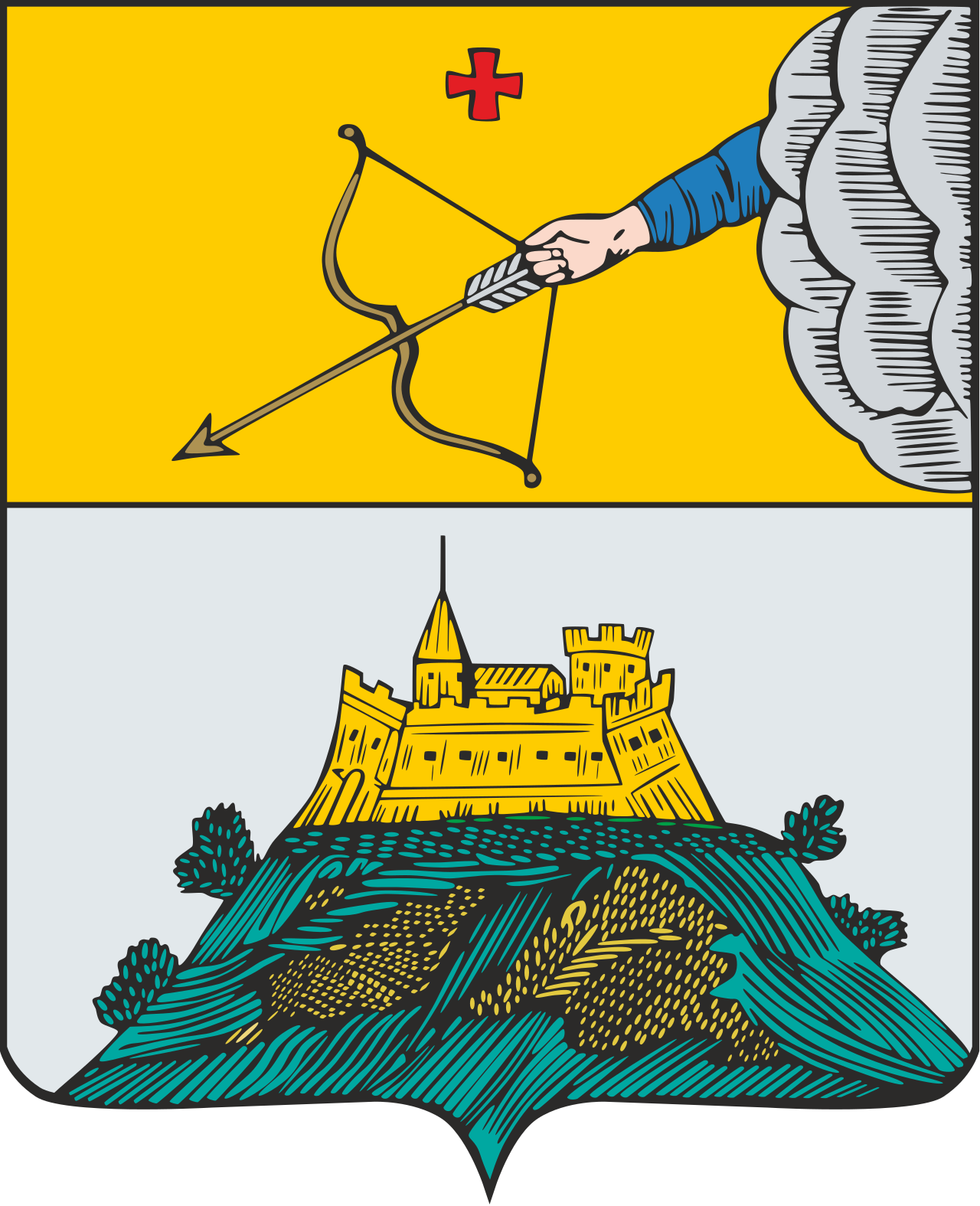 В верхней части щита герб Вятский, в нижней части «в серебряном поле на высокой горе деревянный рубленый город, которым зданием оное место примечания достойно».